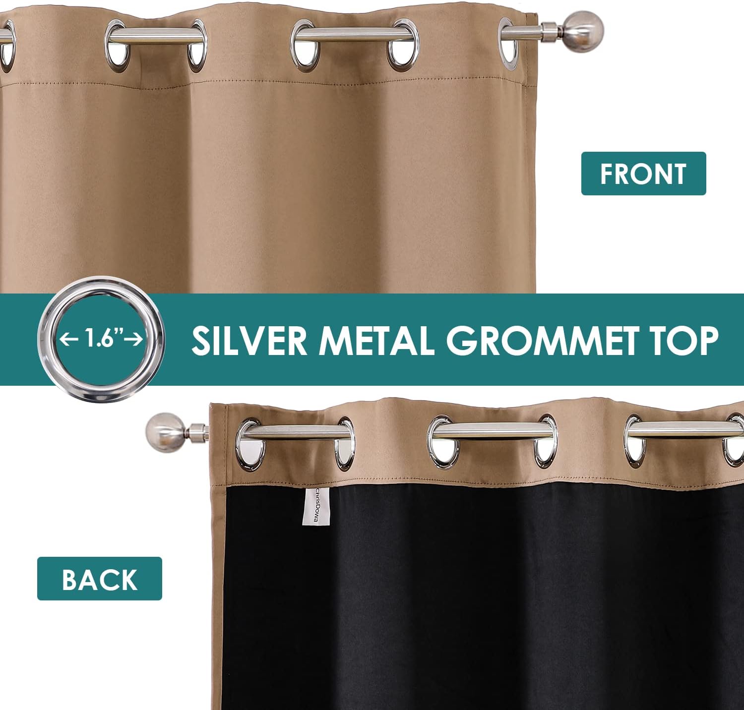 - SET DETAILS: Set of 2 total blackout curtain panels per package. Each lined curtain measures 52 inch wide by 102 inch long with 8 silver metal grommets (1.6 inch inner diameter) on top, easy to install and slide.