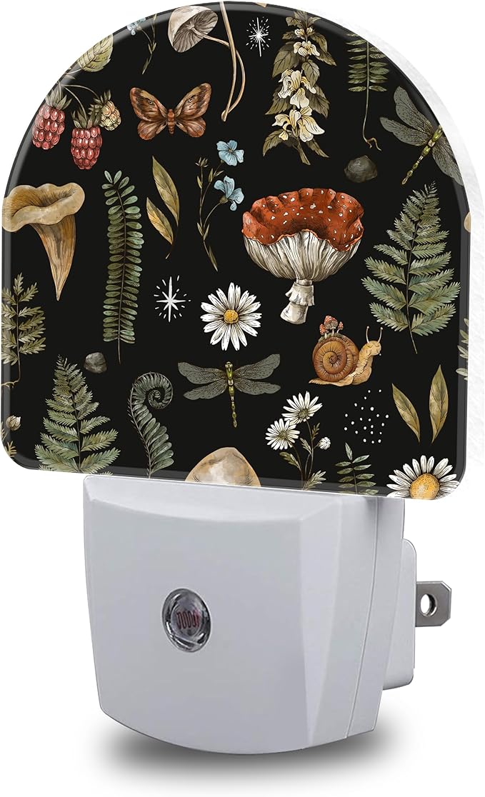 Night Lights Plug into Wall Nature Woodland Mushroom Forest Plants Night Light Dusk to Dawn Smart Sensor Decorative Round Led Lamp for Bedroom Kitchen Hallway Nightlight for Women Men