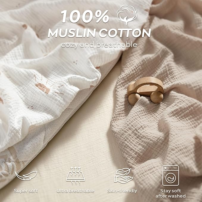 • Super Soft and Breathable Muslin Fabric - Muslin toddler pillowcases are made of 100% muslin cotton, ensuring a breathable, skin-friendly, and ultra-soft surface for your little one. These Toddler Pillow Case Covers retain their softness and vibrant colors even after multiple washes, providing a gentle and cozy feel for your baby’s delicate skin