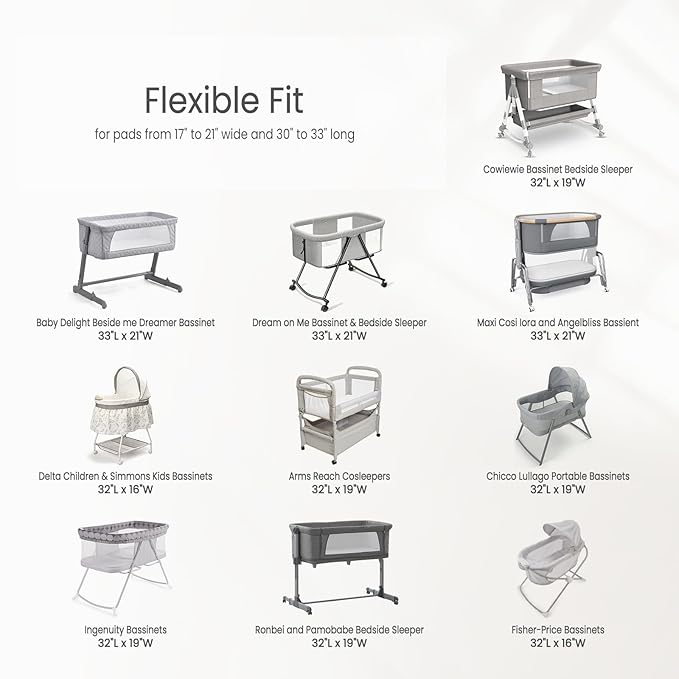 - Flexible Fitted: Our bedside sleeper sheets sized at 33" x 21" x 4" with elastic edges to securely fit most bassinet mattresses (29”-33” long, 17”-21” wide and 1”-2” thick). These bassinet sheets fitted for Maxi Cosi lora, Angelbliss, Baby Delight Beside me Dreamer Bassinet, and other similar-sized brands.