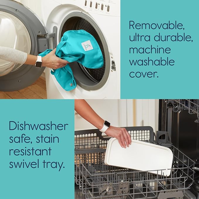 - MACHINE WASHABLE COVER | We all know that babies are messy eaters! Our portable booster seat is designed to effortlessly wipe clean, allowing more quality time with your precious tot. To assist with the inevitable mess, the fabric cover slides off the frame for machine washing - a must have for sanitizing and spaghetti stain removal.