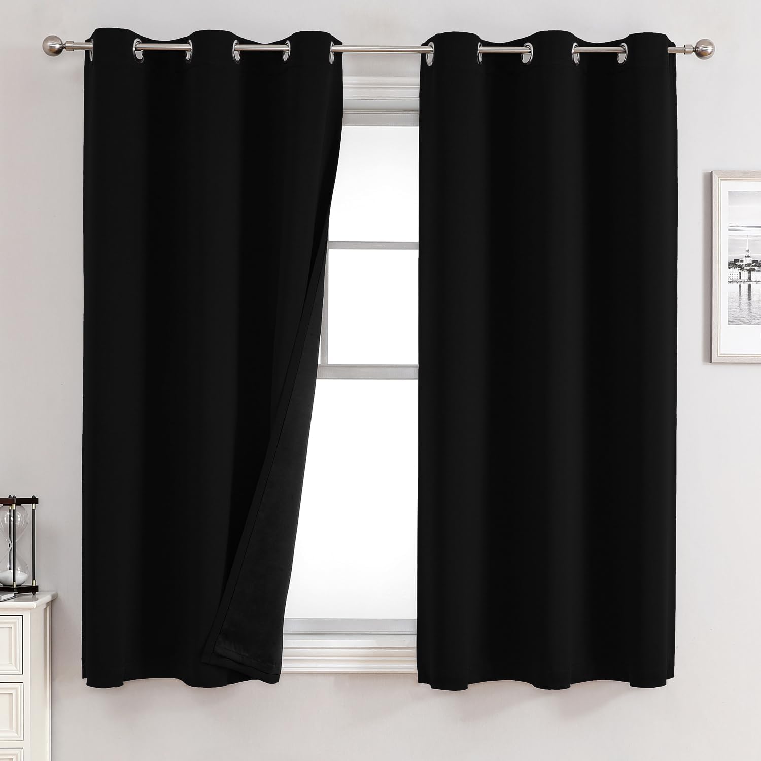 ChrisDowa 100% Blackout Curtains 63 inch Long for Bedroom with Black Liner, 2 Thick Layers Total Blackout Thermal Insulated Grommet Window Curtains 2 Panels Set (Black, 38 x 63 Inch)