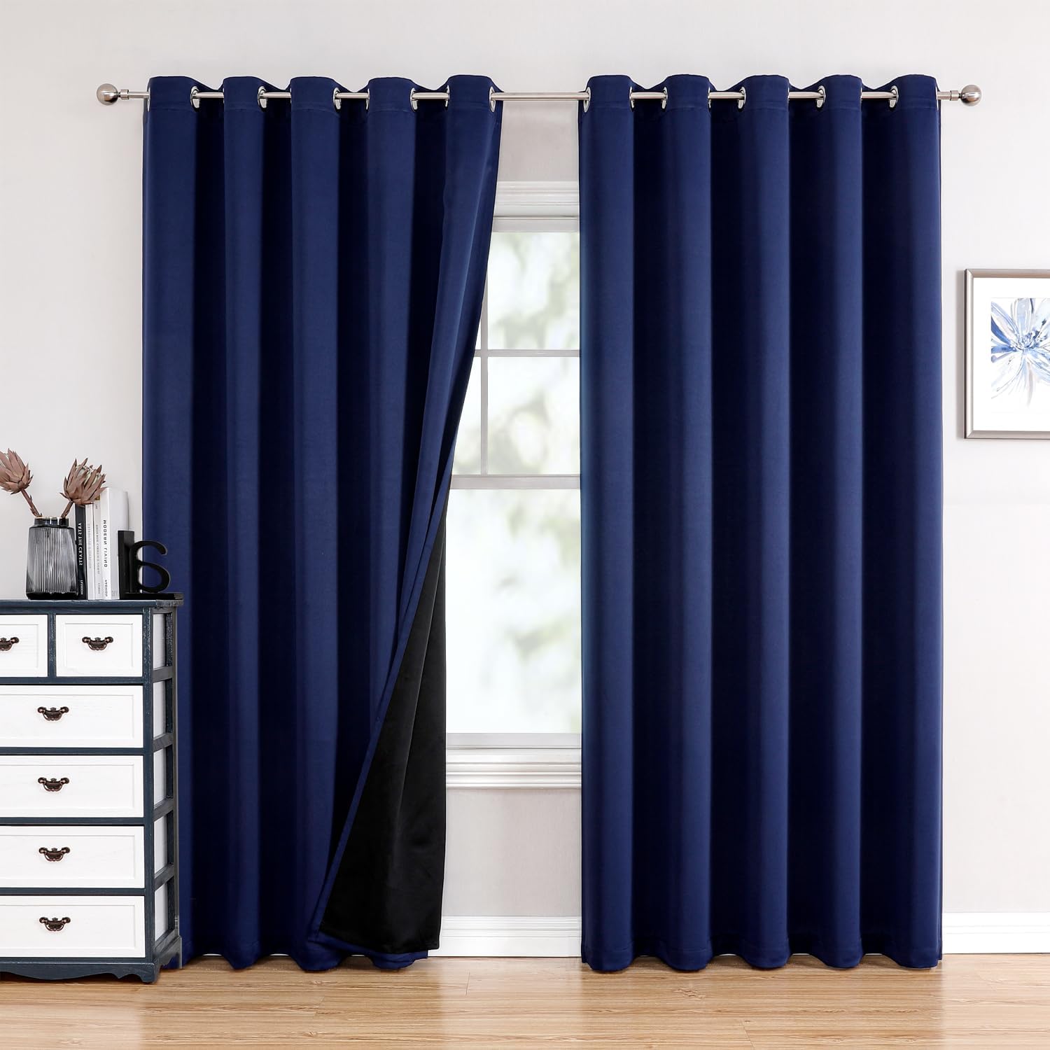 ChrisDowa 100% Blackout Curtains 84 inch Long for Bedroom with Black Liner, Extra Wide 2 Thick Layers Total Blackout Thermal Insulated Grommet Window Curtains 2 Panels Set (Navy Blue, 60 x 84 Inch)