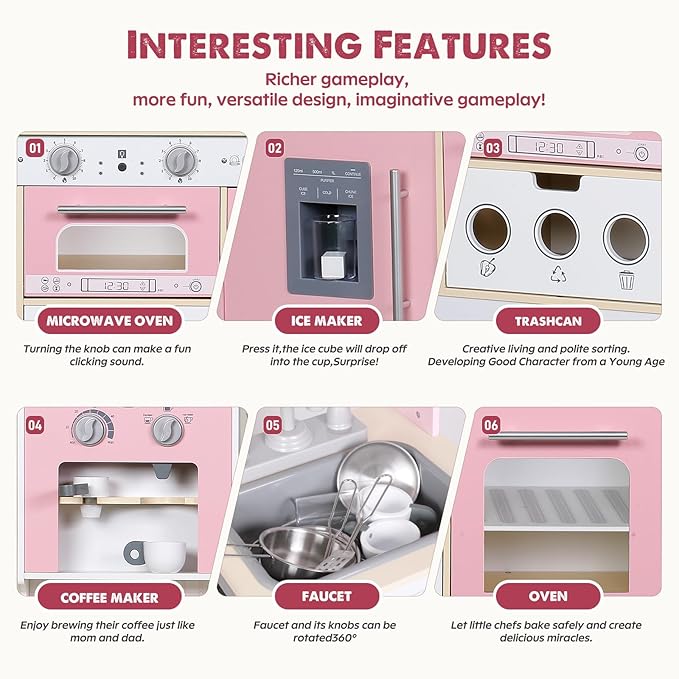 - 🎁Safety And Durability Guaranteed: Our wooden toy kitchen set is made of high-quality, child-safe materials and meets US ASTM F963 and CPSIA standards, ensuring a safe and durable play experience for your children. Our kitchen toy set adds an anti-tip design to ensure that the product will not tip over, protecting your child's safety at all times!