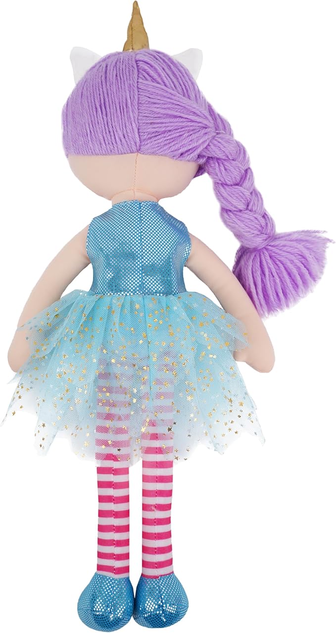 June Garden 16" Unicorn Doll Myra - Purple Hair Plush Rag Doll for Toddler Girls - Soft Companion Gift for 2+ Years - Blue Dress