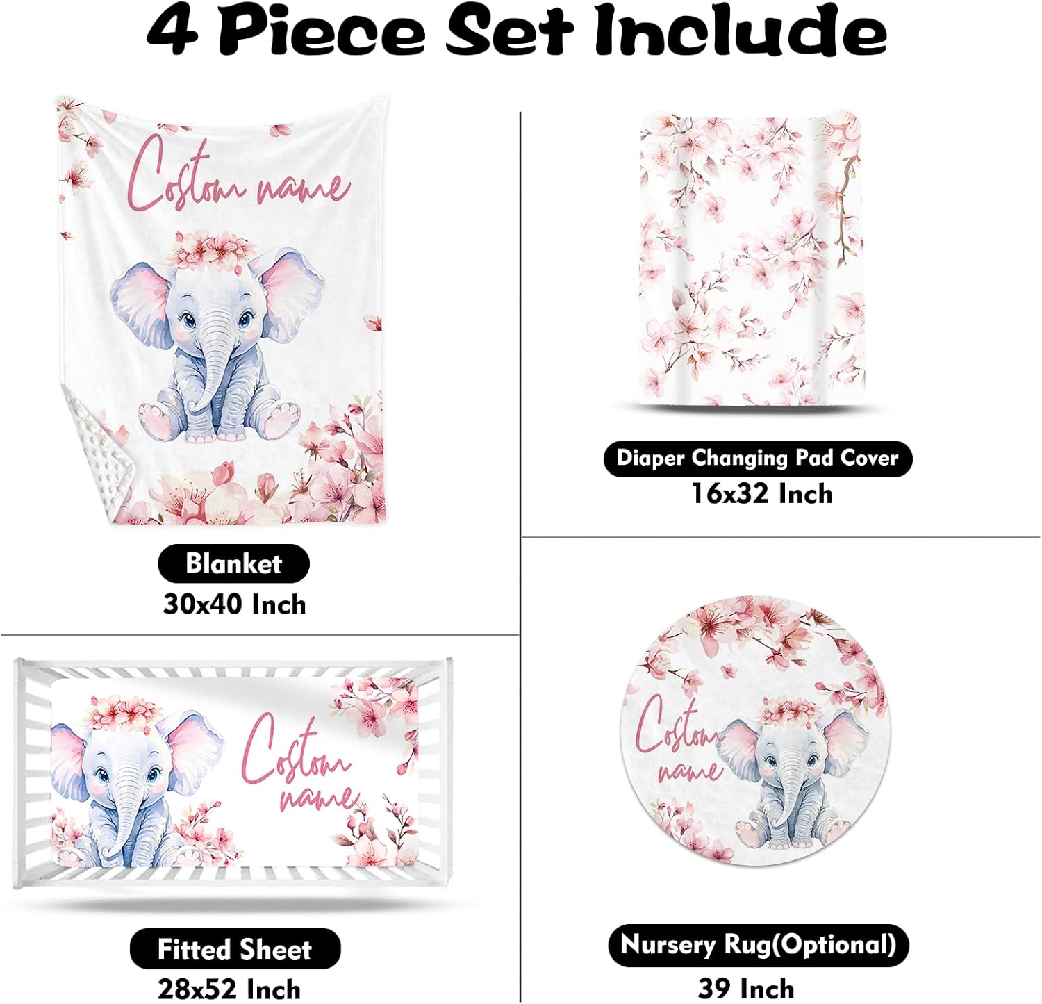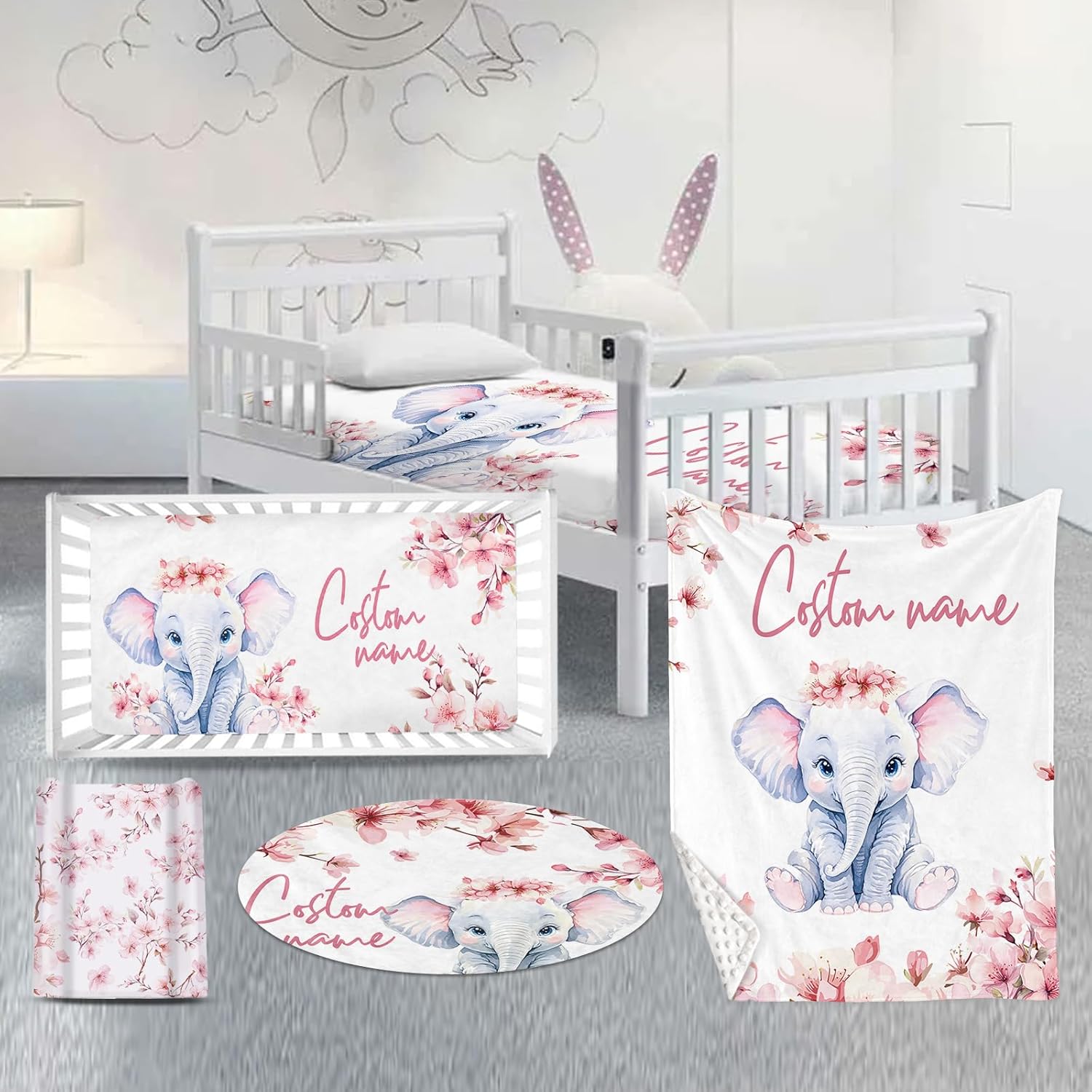 Custom Nursery Crib Bedding Set: 4 Piece Pink Flower Elephant Pattern Baby Crib Sets for Girls with Personalized Name - Toddler Double Layer Blanket Set, Comfortable Crib Bed Sheets for Baby Toddlers