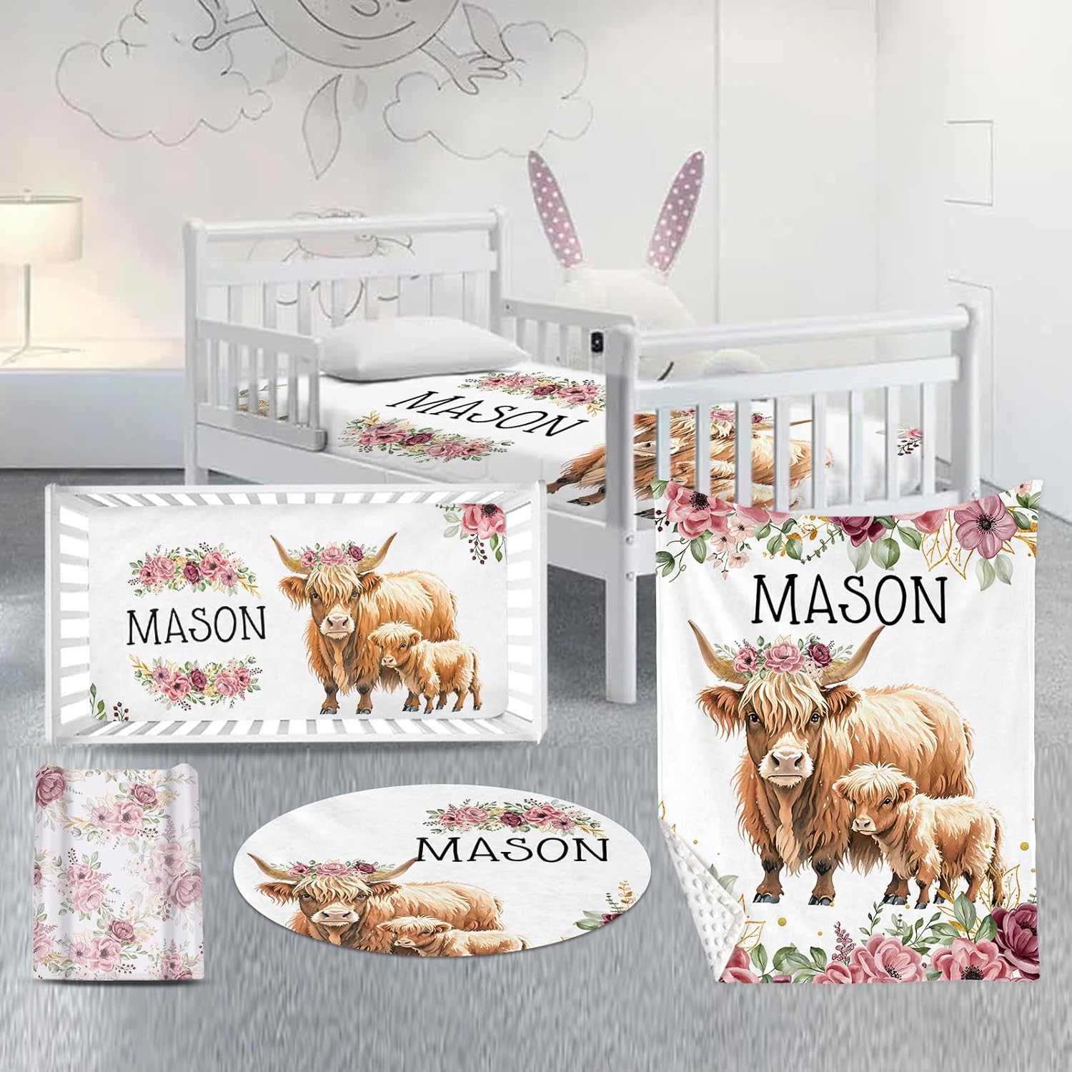 Custom Nursery Crib Bedding Set: Personalized Name 4 Piece Flower Highland Cow Design Baby Crib Sets for Baby Girls - Toddler Double Layer Blanket Set, Comfortable Crib Bed Sheets for Baby Toddlers