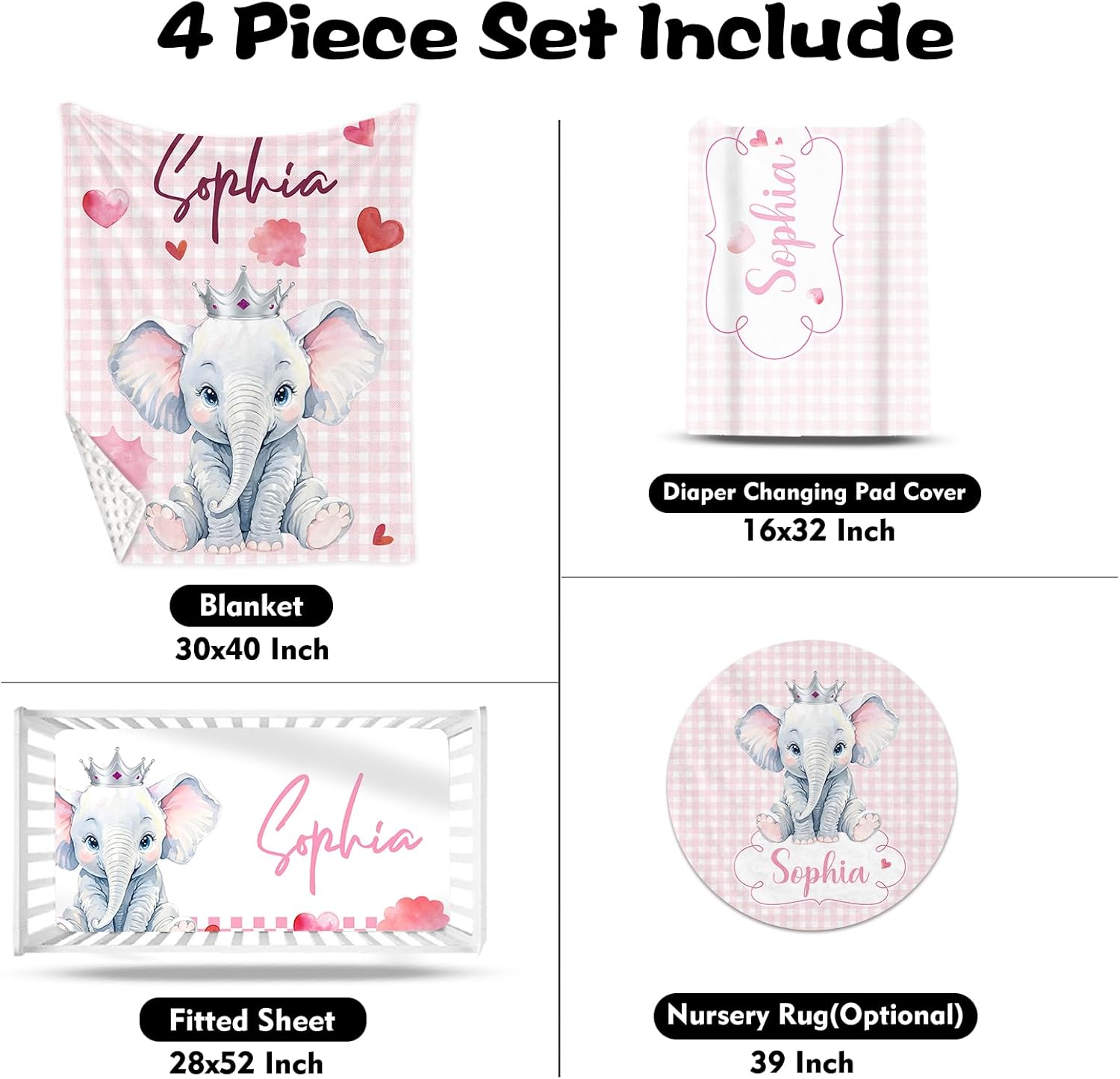 Custom Nursery Crib Bedding Set: Personalized Name 4 Piece Pink Checkered Elephant Pattern Baby Crib Sets for Girls - Toddler Double Layer Blanket Set, Comfortable Crib Bed Sheets for Baby Toddlers