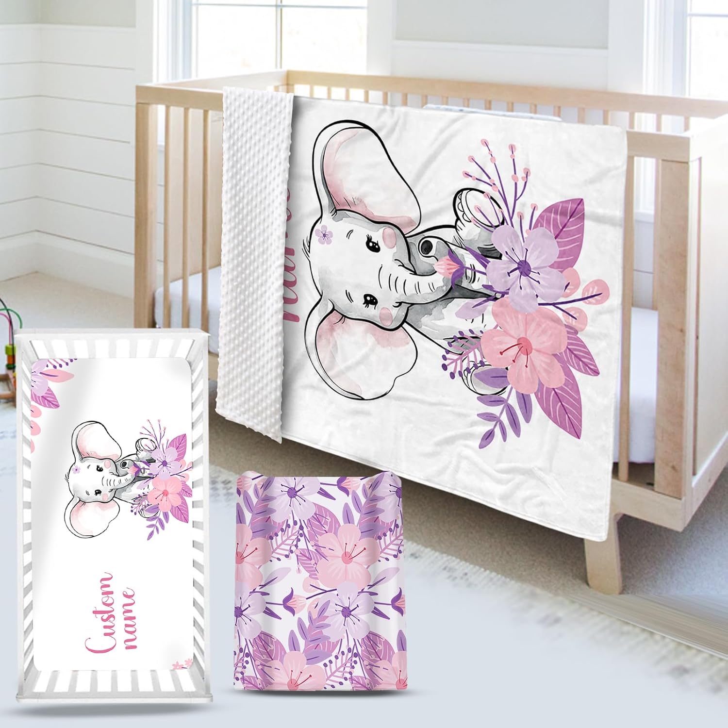 Custom Name Crib Bedding Set - Elephant Theme, Personalized Purple FlowerNursery Bedding 3-Piece Set– Soft Blanket, Fitted Sheet, Changing Pad Cover – for Newborns Girls Nursery Gifts