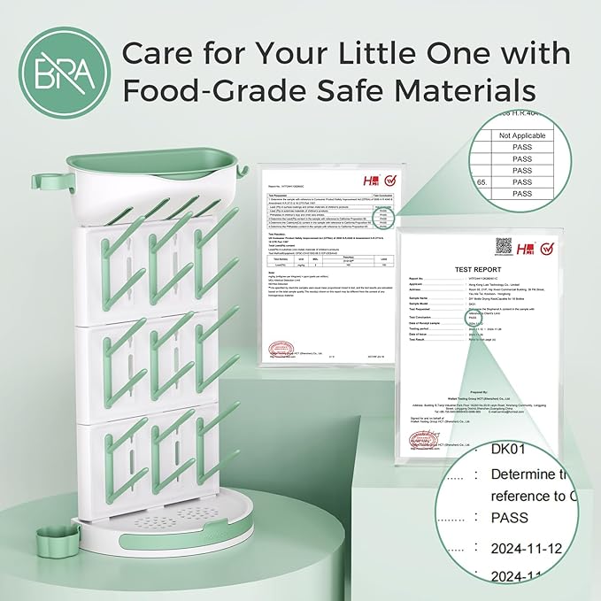 - Safe Materials & Efficient Drying:Made of BPA-free, food-grade plastic for peace of mind. The built-in drainage slot and ventilated backboard minimize water buildup and boost airflow, helping bottles and nipples dry quickly and stay ready for the next feed with this baby bottle drying rack