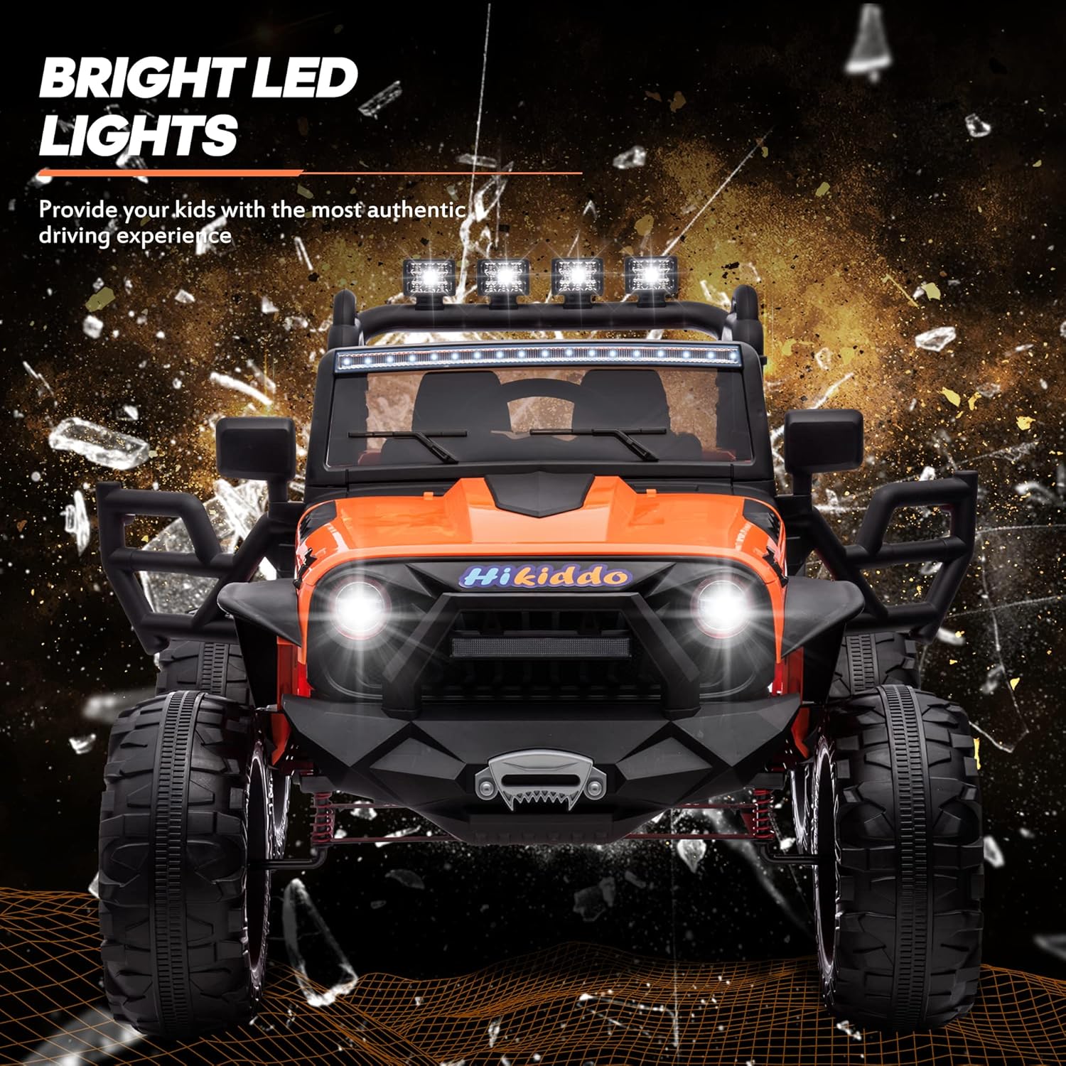 - BRIGHT AND COOL LIGHTS: This 24V 2 seater kids ride on car comes with bright headlights, taillights, and four LED searchlights to illuminate the surroundings day or night, ensuring a safe drive for kids!