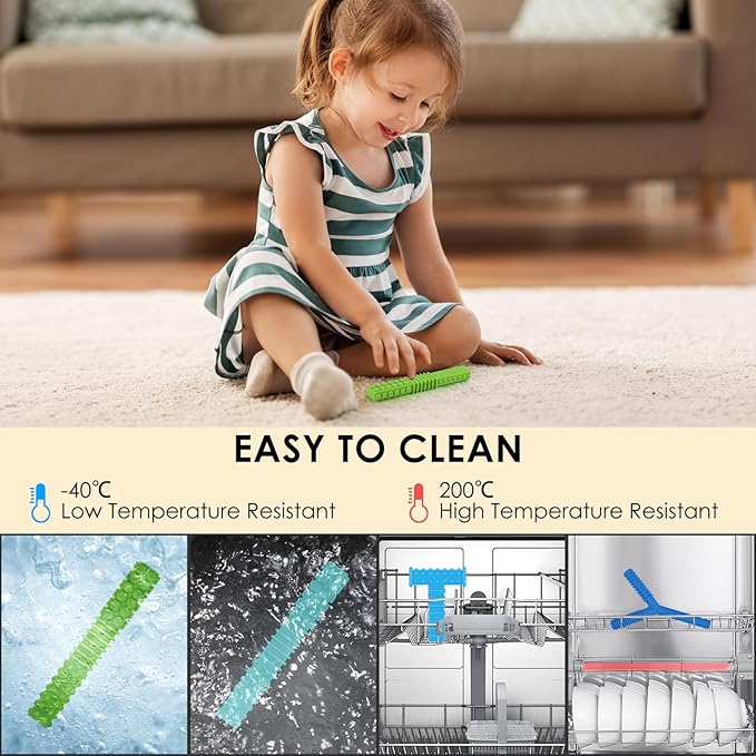 - EASY TO CLEAN: very easy to clean, just wash the sensory chewing toys with soapy water, or wash it with dishwasher. Our teethers for babies can be sterilized by boiling water, steam sterilizer and sunlight. -40℃ to 200℃ Temperature resistant, we suggest cleaning it before first use and after each use