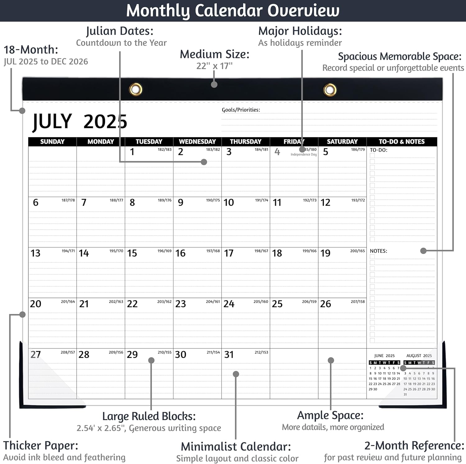 - π LARGE DESK CALENDAR 2025-2026 β July 2025 β December 2026, this desk calendar large covers 18 months calendar for an easier yearly planning or tracking. Size: 22ββ x 17ββ, the large calendar provides spacious writing space for daily scheduling.