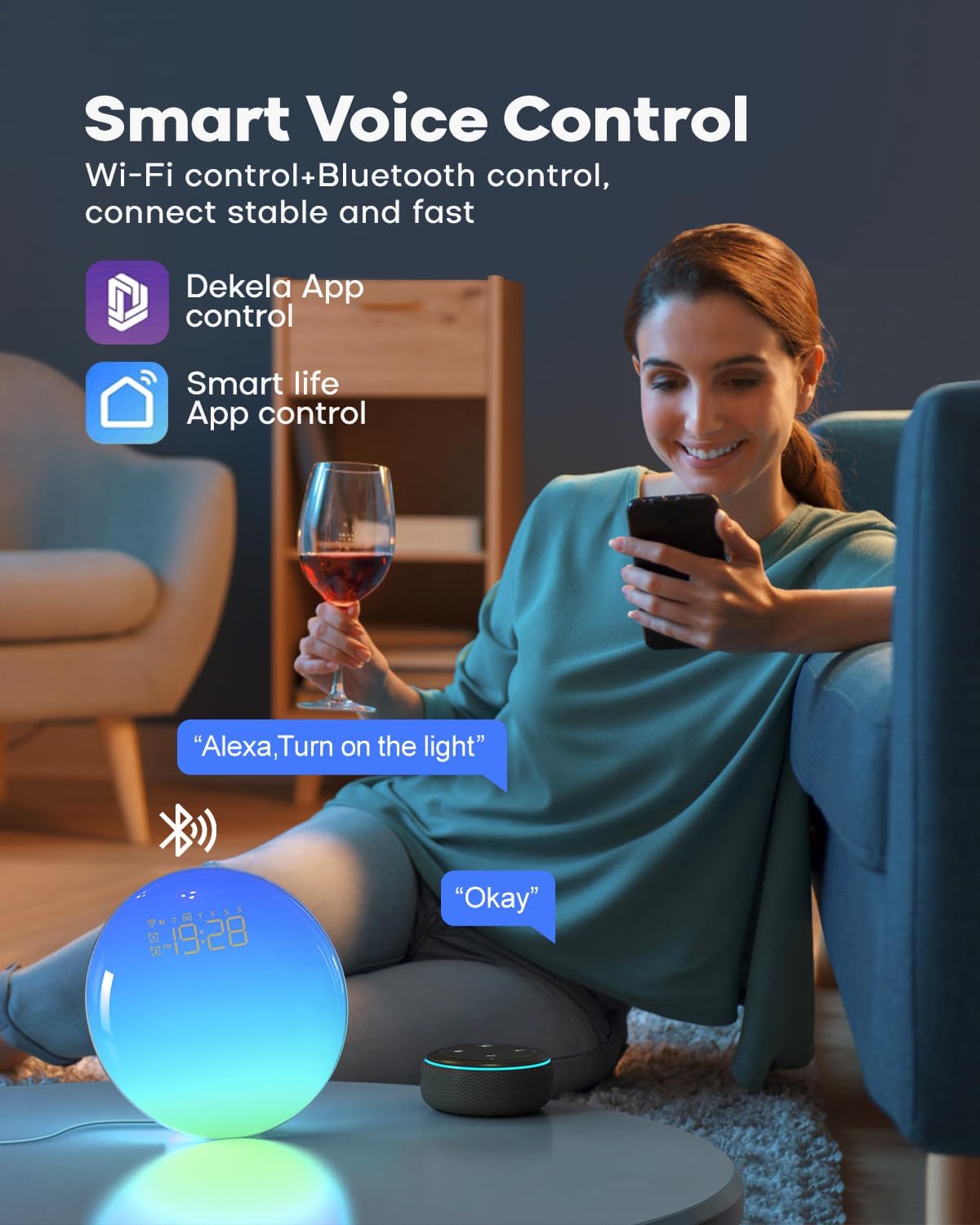 - Voice Control & App Control: The smart alarm clock wake up light supports Alexa voice commands and can be controlled via DEKALA and Smart Life Apps. Adjust the light alarm clock sunrise brightness and sounds remotely for a personalized wake-up experience.
