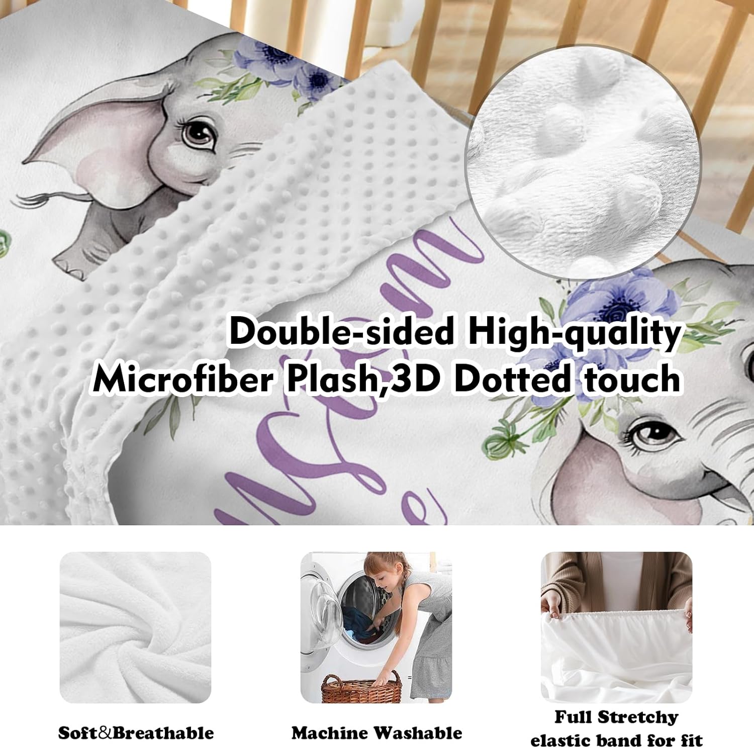 Personalized Baby Crib Bedding Set for Baby Girls, Purple Flower Pattern Elephant Theme Custom Name Baby Crib Sets 5-Pcs, Toddler Double Layer Blanket Fitted Sheets Changing Pad Cover Rug Wall Art Set