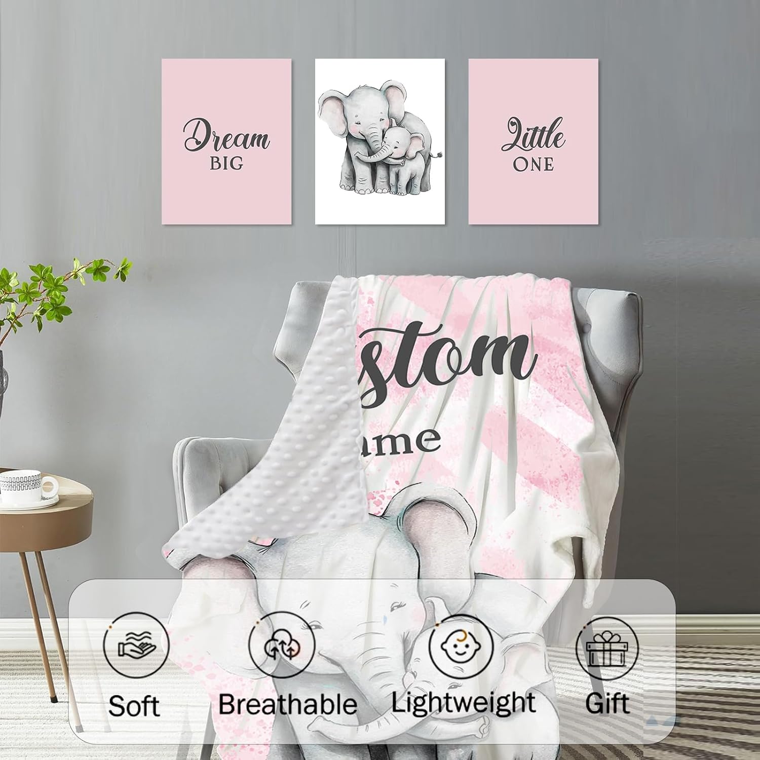 Personalized Baby Crib Bedding Set for Baby Girls, Pink Elephant Design Custom Name Baby Crib Sets 5-Pcs, Toddler Double Layer Blanket Fitted Sheets Changing Pad Cover Rug Wall Art Set