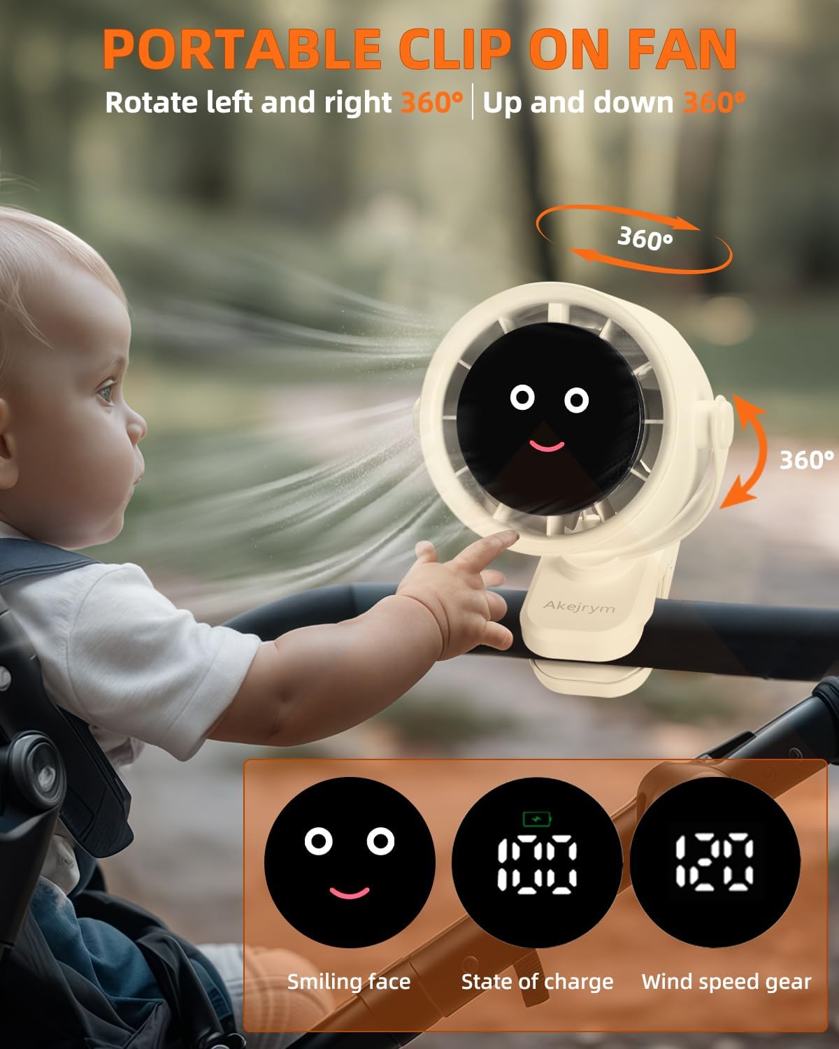 - 【360° Rotation and 5 Speeds】Akejrym Baby Stroller fan head can be adjusted vertically and horizontally in any direction, providing cool airflow from all directions to keep your baby comfortable in hot weather;It has 5 different speeds for different purposes, which is more comfortable for babies.