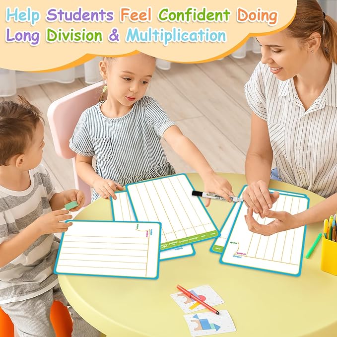 - REVERSIBLE MATH CARD DESIGN: Each card features a double-sided design, allowing students to work on two math problems simultaneously. One side is dedicated to addition, subtraction, and multiplication, while the other side focuses on organizing long division problems. Students can practice a wide range of math skills on one board