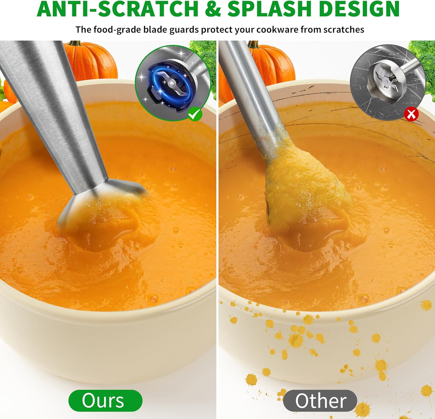 - 【𝐀𝐍𝐓𝐈-𝐒𝐂𝐑𝐀𝐓𝐂𝐇 & 𝐀𝐍𝐓𝐈-𝐒𝐏𝐋𝐀𝐒𝐇】: The 304 stainless steel blades are sharp and durable, easily blending large or tough ingredients (Tips: Not suitable for very hard items like ice cubes or coffee beans). The food-grade semi-enclosed blade guard safe to use even in hot soup. It protects your containers from scratches and effectively prevents splashing, keeping both you and your kitchen clean.