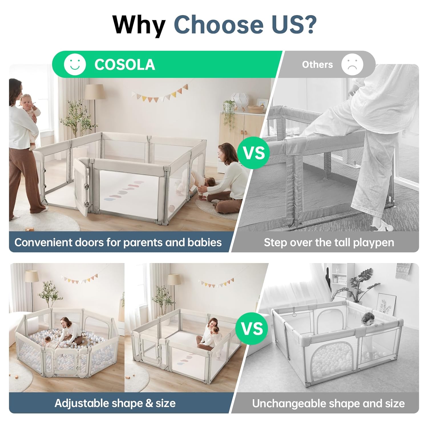- [VERSATILE & AJUSTABLE]: This foldable baby playpen is made up of 8 panels that can be easily arranged into various shapes to suit your space at your will. Plus, with a baby door and two zipper doors, your child can easily enter and exit.It’s not just about keeping your child safe,it’s about giving them the freedom to explore while you relax!