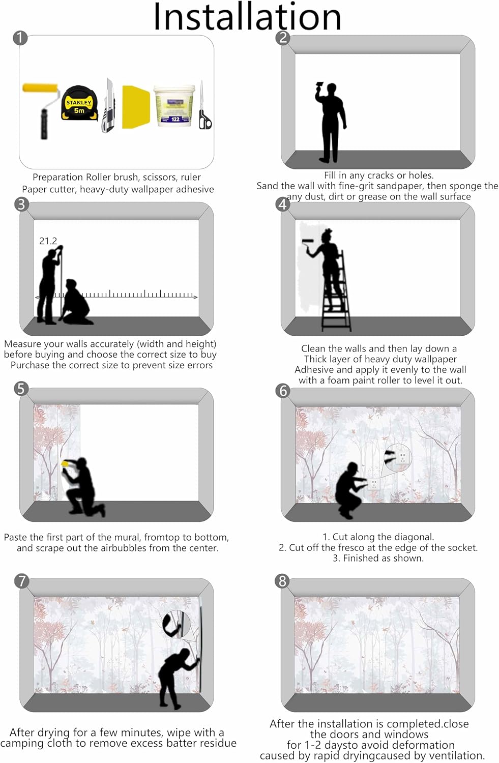 - Installation Steps1. Fill in any cracks or holes and clean the surface of the wall of dust, dirt and grease.2. Apply heavy-duty wallpaper paste to the wall, not the mural.3. Mark the position of each strip of wallpaper with a spirit level.4. Align the pattern and slide it into place.5. Scrape the bubbles with a spatula.6. Let it dry for a couple of minutes and it's ready to go!