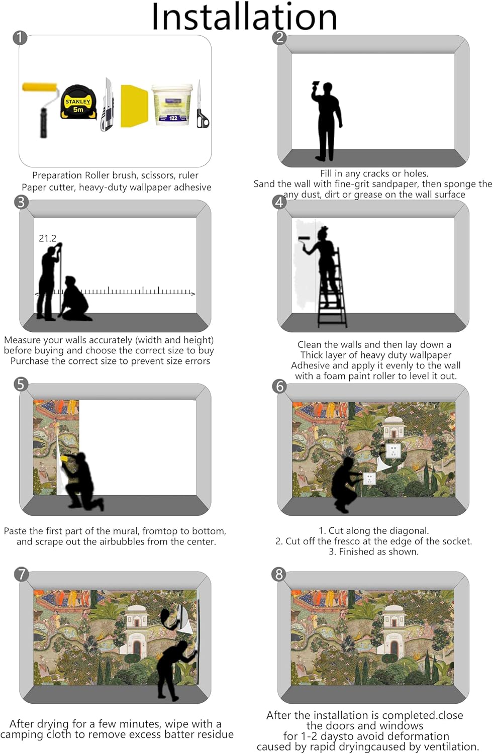 - Installation Steps1. Fill in any cracks or holes and clean the surface of the wall of dust, dirt and grease.2. Apply heavy-duty wallpaper paste to the wall, not the mural.3. Mark the position of each strip of wallpaper with a spirit level.4. Align the pattern and slide it into place.5. Scrape the bubbles with a spatula.6. Let it dry for a couple of minutes and it's ready to go!