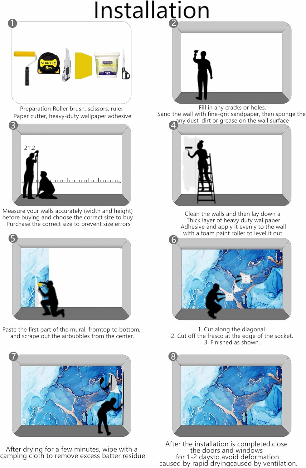 - Installation Steps1. Fill in any cracks or holes and clean the surface of the wall of dust, dirt and grease.2. Apply heavy-duty wallpaper paste to the wall, not the mural.3. Mark the position of each strip of wallpaper with a spirit level.4. Align the pattern and slide it into place.5. Scrape the bubbles with a spatula.6. Let it dry for a couple of minutes and it's ready to go!