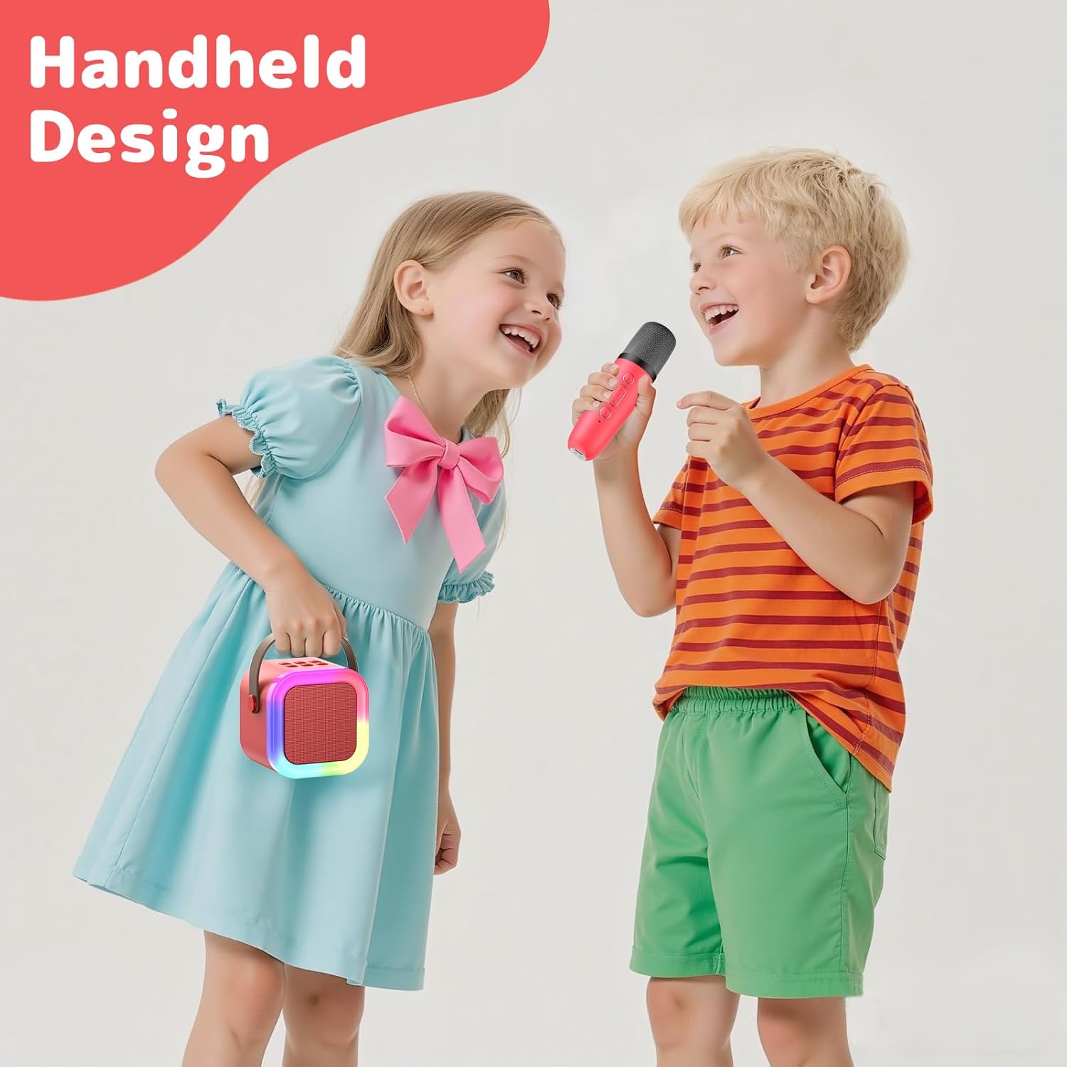 - 【Long Playing Time and Lightweight】Convenient to Carry, Built-in rechargeable battery ensures 5-10 hours of entertainment time. The portable speaker has a compact size of only 2.8*2.8*2.8 inches, and the diameter of the microphone handle is only 1.4 inches, making it easy for even a 3-year-old girl to hold. The corners and edges of the karaoke machine and microphone are soft and smooth, suitable for safe use by boys and girls aged 4-10.