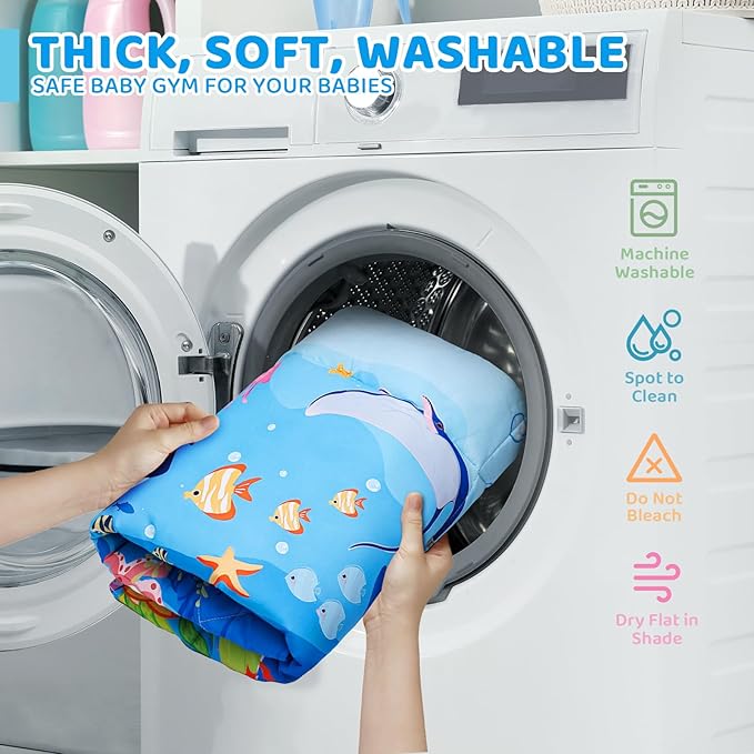 - Soft, Safe, and Washable - The baby gym play mat is made from high-quality fabrics, thick, delicate, and smooth touch, safe and comfortable for baby skins. Machine washable, easy to clean and keep hygienic. The tummy time activity mat can also be used directly on the floor, providing cushioning and protection for the baby. The balance of flatness and softness makes it more stable for babies to sit, stand and crawl.