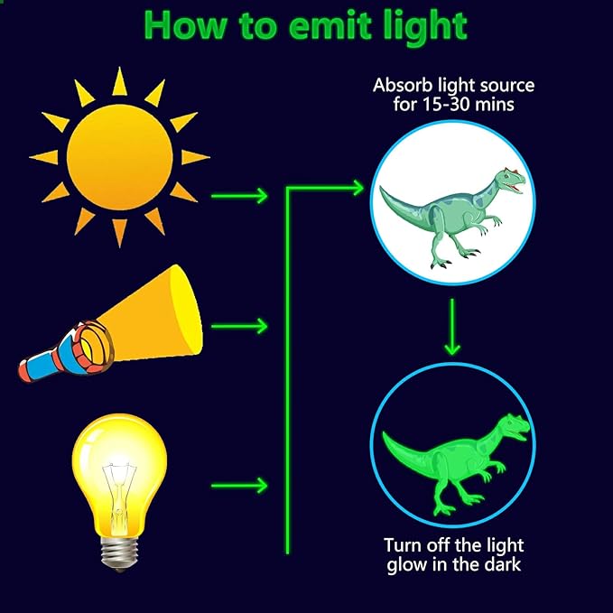 - ✦ Glow Dino Wall Decals: These glow wall decals for ceiling are made of quality luminous material,they will glow brightly when absorb enough light during the day. You just need to put it under lamplight flashlight ,room light or sunshine for 15 minutes, it will keep glowing for 8-10 hours with a gentle green fluorescent light. Please ensure the light shines on the decals without obstruction, the longer it takes to absorb light, then to light up for up to longer.