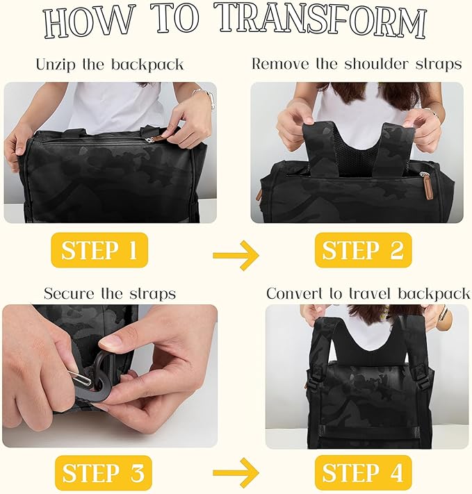 - 👜🍼4 Ways to Wear - Taking into account all your travel needs, we have designed 4 option to wear: tote, crossbody diaper bag, backpack and luggage bag. Strap is adjustable and removal, backpack strap can be hidden in the back pocket.