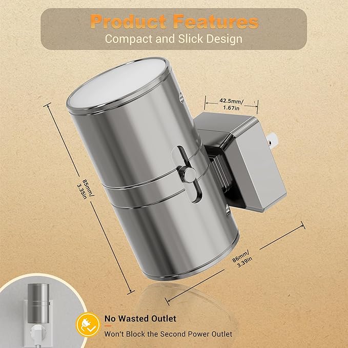 - Upgraded Electroplated Casing Nightlights: This modern night light features a sleek silver cylindrical frame made from upgraded electroplated materials. The refined finish not only enhances its aesthetic appeal but also ensures long-lasting durability. The light radiates from top to bottom, combining vintage style with practicality to complement any space.