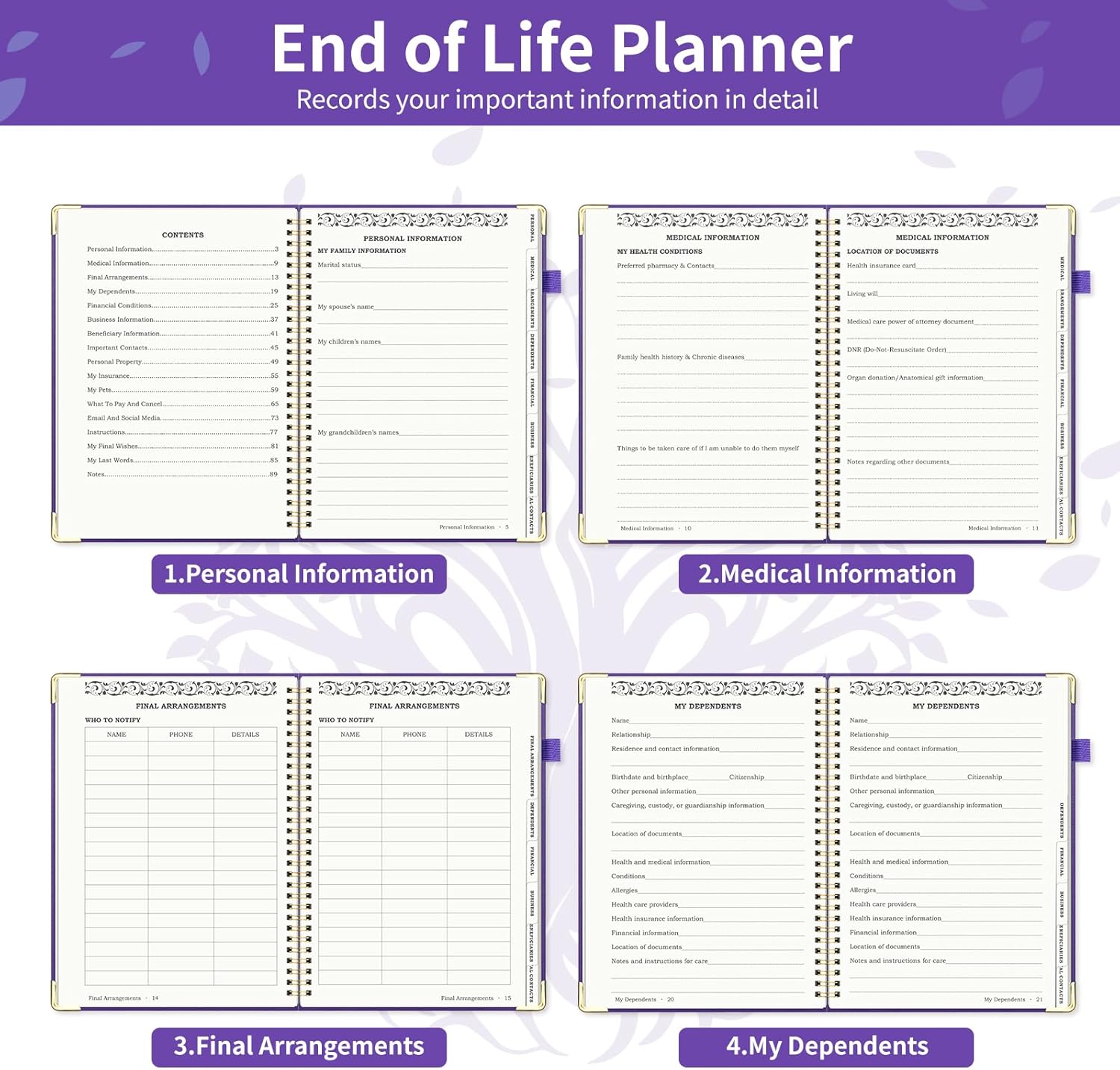 - Comprehensive Structure: The death book planner includes 16 detailed sections such as catalog pages, personal and family info, medical info, property and financial assets, beneficiaries, pet info, insurance coverage, active accounts, memberships, funeral arrangements, and final wishes.