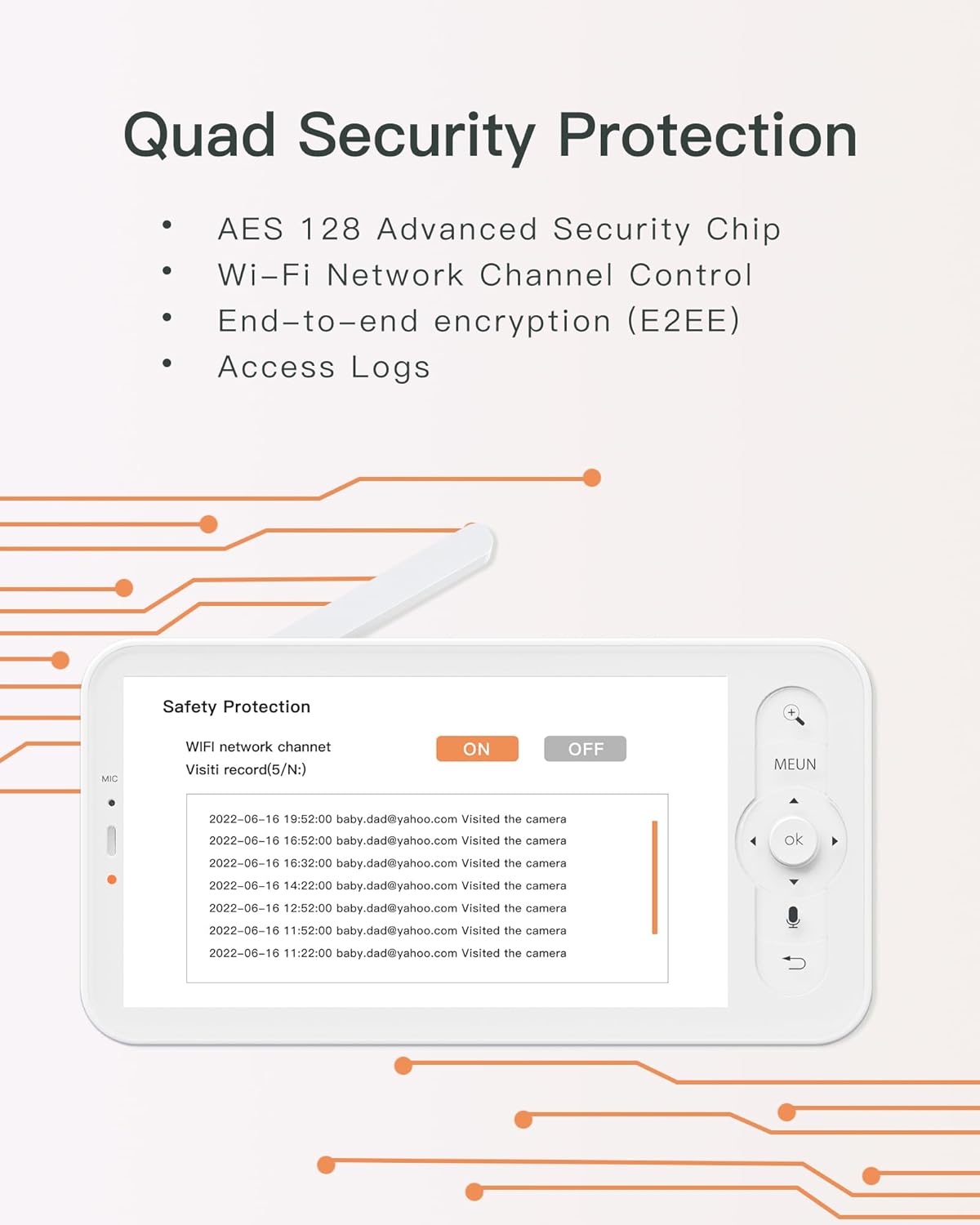 - Easy Installation & Dual Usage - Enjoy plug-and-play convenience with two options to use. Use the LCD screen without wifi at home. Support range of 1000ft(max). Remotely control the baby monitor by smartphone app when going out. Our hopping and digital encryption technology ensures security and reliability. Note that the baby camera must connect to the same 2.4G WiFi (not 5G) as the phone app during the initial setup.