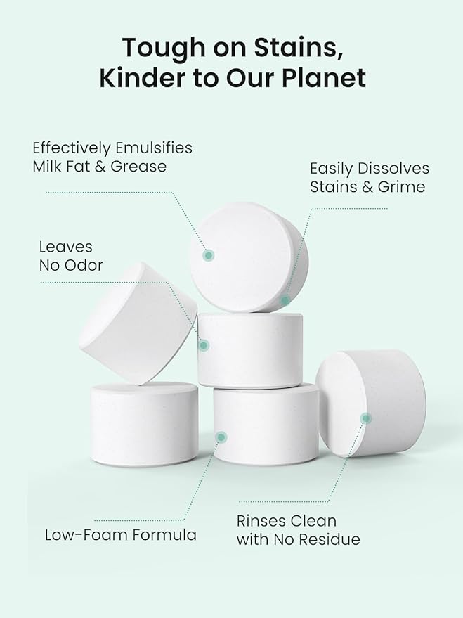 - Multi-Purpose Cleaning: Specially designed for all bottle washer machines, these tablets deliver powerful cleaning for your baby’s bottles, pump parts, and other essentials. Our gentle and effective natural enzyme formula is designed with the environment in mind, ensuring no harmful chemical residues are left behind.