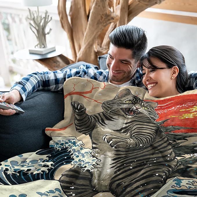 - Unique Japanese Ukiyo-e Design:Inspired by traditional Ukiyo-e art, this blanket features a playful cat design with a dinosaur-like roar, combining humor and artistry. The vibrant colors and whimsical design make it a standout piece, adding a charming and fun touch to any room or cat lover's decor.