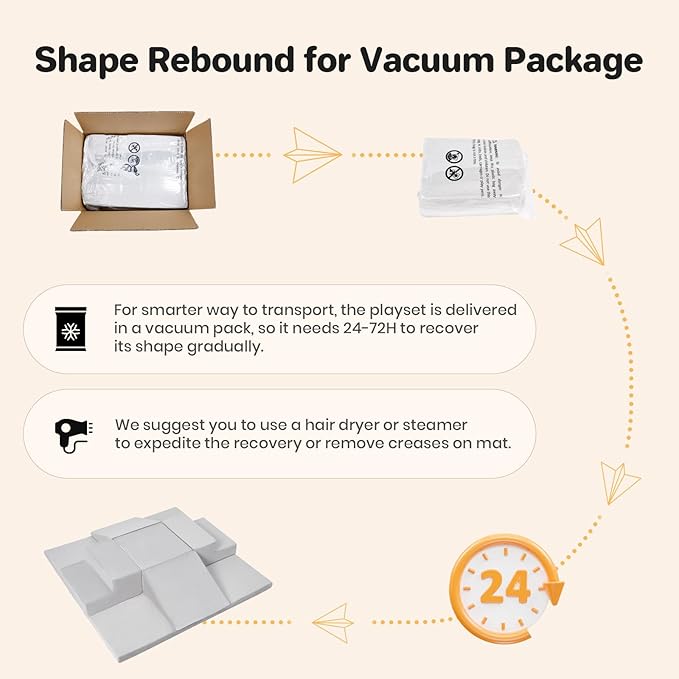 - Ready to Play - No assembly is required, immediately ready for use. The play blocks is delivered in a vacuum pack, so it needs a minimum of 24H to recover its shape. Usually it takes 24 to 72 hours for the foam to regain its shape. Use the Velcro to connect the climbing blocks for extra stability. Storage is also a breeze since you can stack it at corner.