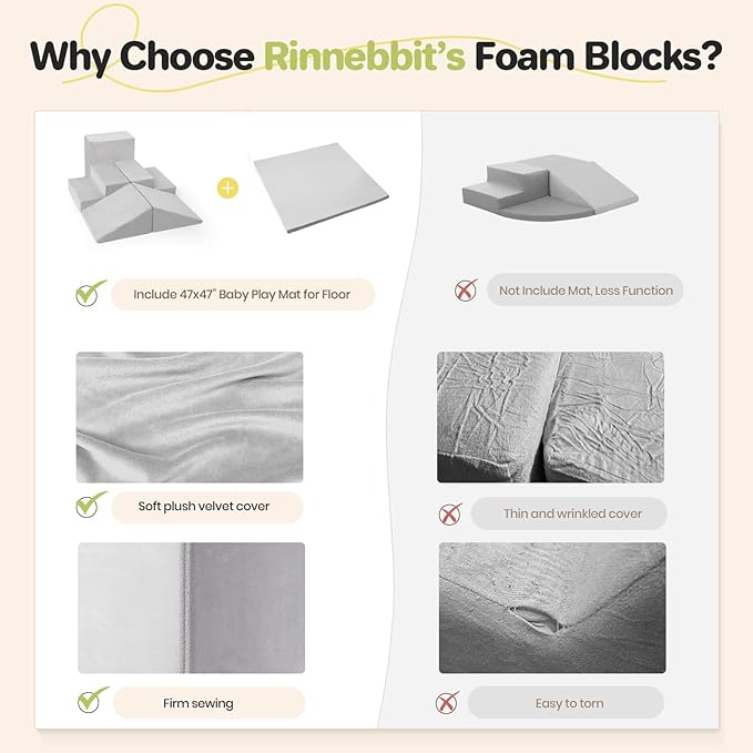 - 6-Piece Foam Play Set - Rineebbit soft play equipment includes 2 stepping stairs, 2 ramps, 1 square, 1 baby play mat for floor with the dimension of 47.2 x 47.2 inches. Babies can stack, climb, slide, and arrange them into all kinds of fun setups, which is also easy for little ones to move around. This soft play set promotes babies’ movement and sparks creativity. It is amazing for their gross motor skills and keeps them active indoors, which is also a lifesaver on rainy days.