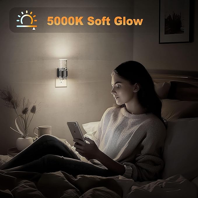 - Modern and Stylish Night Light: This plug-in bubble night light features a sleek, wall sconce-inspired design with a metallic electroplated black ring, adding a contemporary and sophisticated touch. Its dual-directional light emission (upward and downward) makes it a perfect lighting solution for bedrooms, living rooms, and hallways.