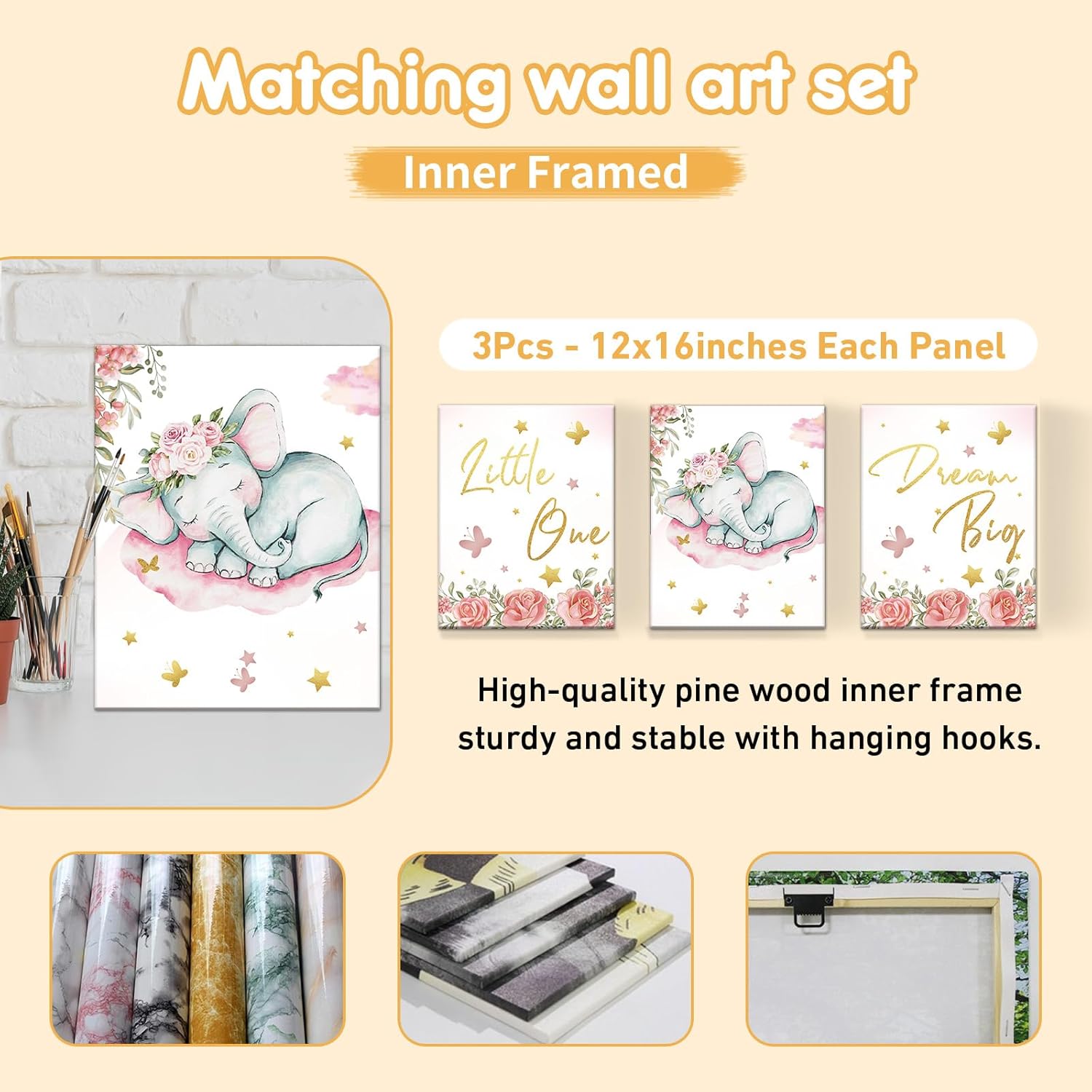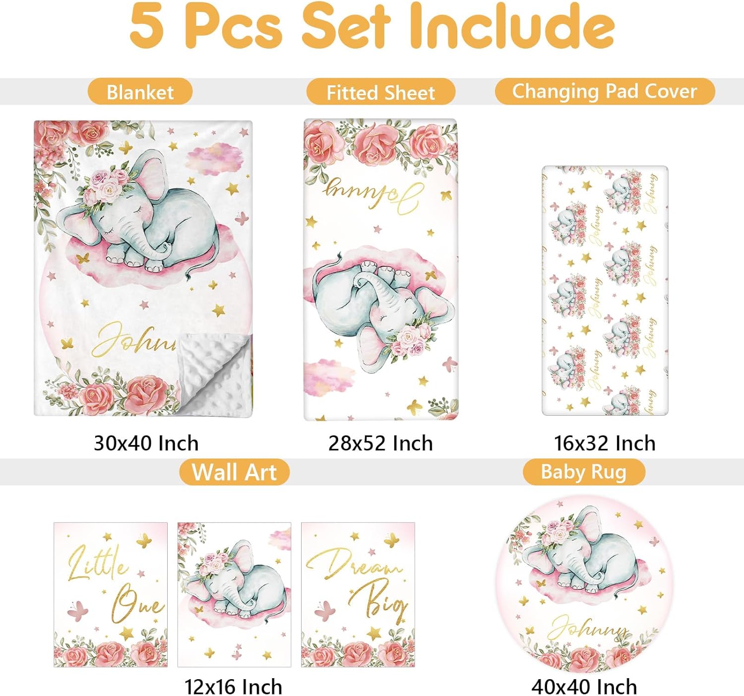 Custom Baby Crib Bedding Set, 5 Pcs Personalized Name Baby Crib Sets for Infant Toddler, Floral Elephant Nursery Bedding Set for Baby Girls, Double Layer Baby Bedding Sets Customized Gifts