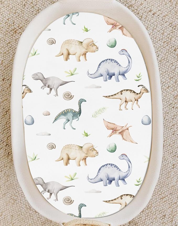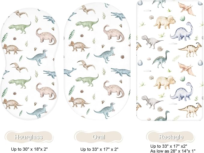 Bassinet Sheets for Baby Girls Boys 2 Pack, Fitted Baby Mattress Sheet for Rectangle, Oval, Hourglass Bassinet Mattress, Breathable Cozy & Universal Fit (Dino Pals)