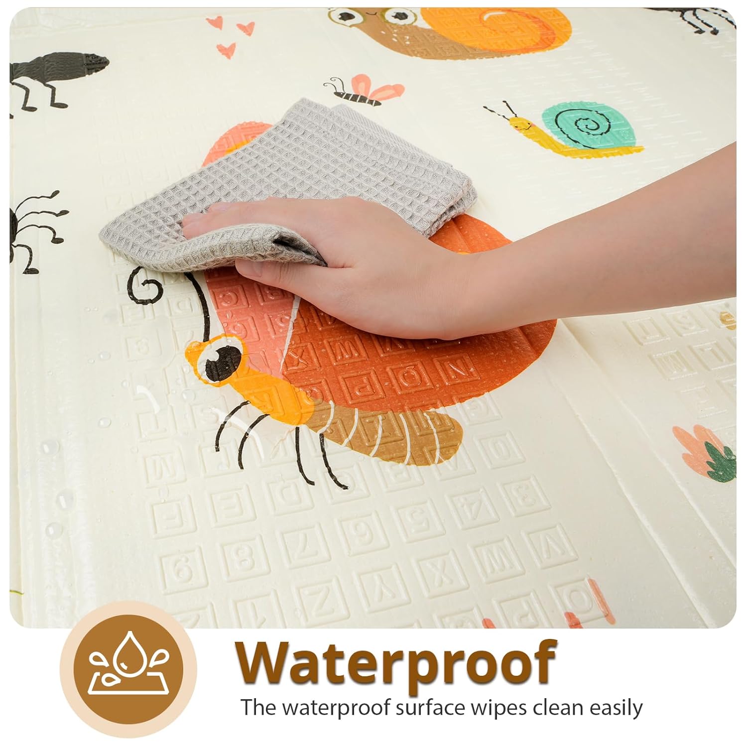 - WATERPROOF & EASY TO CLEAN: The surface of this crawling mat is 100% waterproof, water and milk stains will not soak the mat, what you need to do is wipe it with a damp towel to keep the playmat for the floor clean as new.