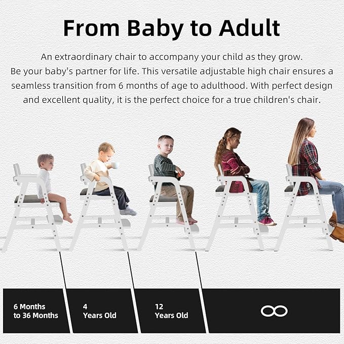 - One Chair for Many Years: Adjustable high chair with adjustable foot rest, one wooden high chair for Toddlers to Teens. 4 position seat height and 3 footrest adjustable suitable for 2-13 years old child. The height of seat is adjustable to match different table height. Foot rest is adjustable and child can put their feet on it for support. You don't need to purchase another highchair for your kids as they grow up