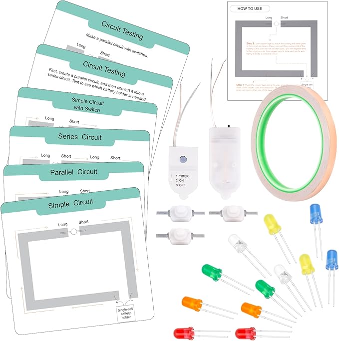 - All-In-One Exploration Kit: No soldering or tools needed! Includes circuit cards, LED diodes, copper foil tape, button coin cell battery holders and button switches. Simply use copper tape to create conductive pathways, install the LED bulbs to bring the circuit to life, and then connect the circuit to the wires of the battery case. Sparks curiosity in DIY engineering projects and science experiments for kids