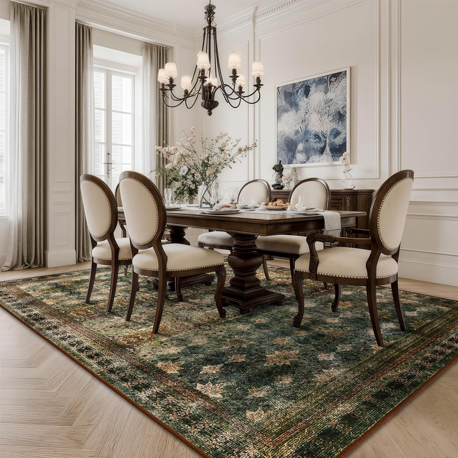 5x7 Washable Area Rug for Living Room Rustic, Non Slip Vintage Floral Bedroom Rugs Retro, Traditional Indoor Floor Carpet for Dining Room, Farmhouse, Office Classroom(Dark Green/Brown/Multi)