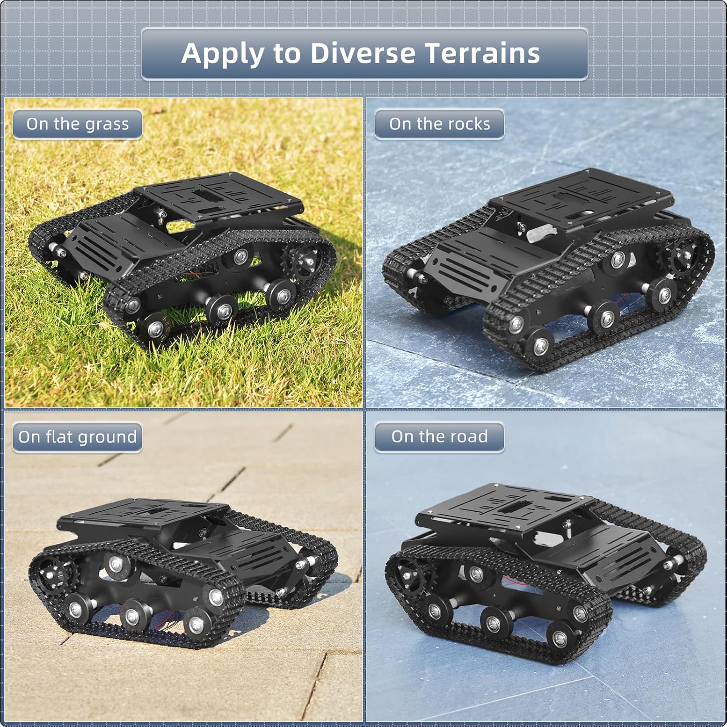 - 【High strength robot tank base】This is an agile tracked chassis, low noise and easy to control, which is a good partner for you to learning robotics.The robot chassis uses high strength aluminum alloy which makes it extremely solid and durable. The top bracket can be disassembled at will, so that you can achieve more expansion.
