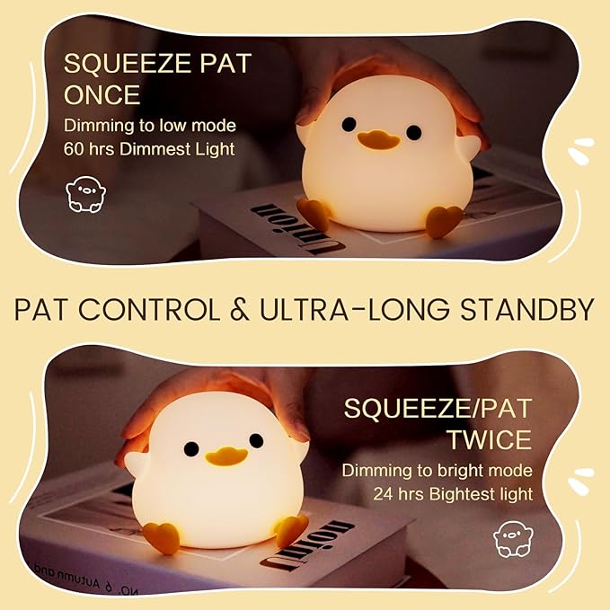 - 2 Levels Dimmable & 20mins Timmer: With 2 brightness settings controlled by a simple tap on the animal's bottom, plus a convenient 20-minute auto shut-off feature, this night light provides the perfect amount of soft, warm lighting for a cozy atmosphere. With a built-in 1200mAh rechargeable battery, this duck lamp can run for up to 24 hours on a single charge, making it portable and wireless for use during nighttime feedings, camping trips, or as an emergency light.
