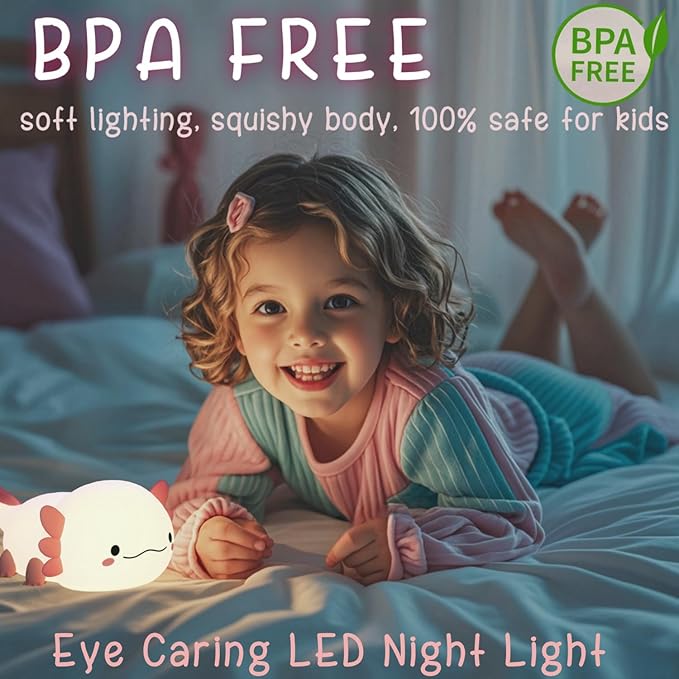 - Multi-functional Led Squish Lamp: The light up axolotl provides a soft, gentle glow that can help comfort children at night and alleviate fear of the dark, soothe kids to sleep(boys girls bedside lamp). In addition, this axolotl night light can also help the elderly go to the bathroom at night or relieve stress for busy young people(nursing light). Meanwhile, it can serve as cool, weird and cute decor for desks, bookshelves, bedrooms, or college dorm. What a cute/kawaii novelty stuff!
