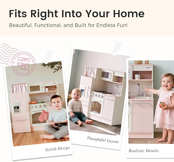 - All-in-One Functional Areas: Includes a stovetop, sink, microwave, oven, pretend ice dispenser, coffee station, and open shelving. Encourages imaginative play while helping kids understand everyday kitchen routines.