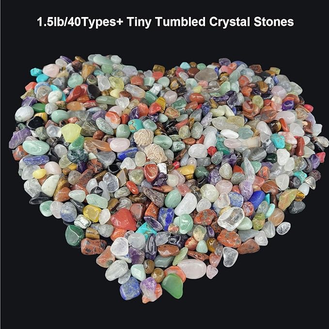 - Chip crystals and natural rough stones:package comes no less than 40types (1.5lb)tumbled chip crystals and no less than 25types natural mini raw crystals(1lb)